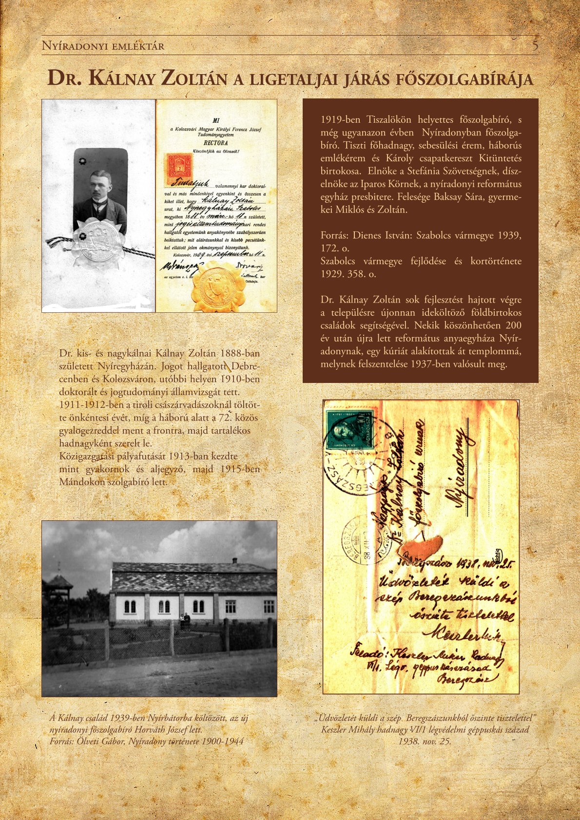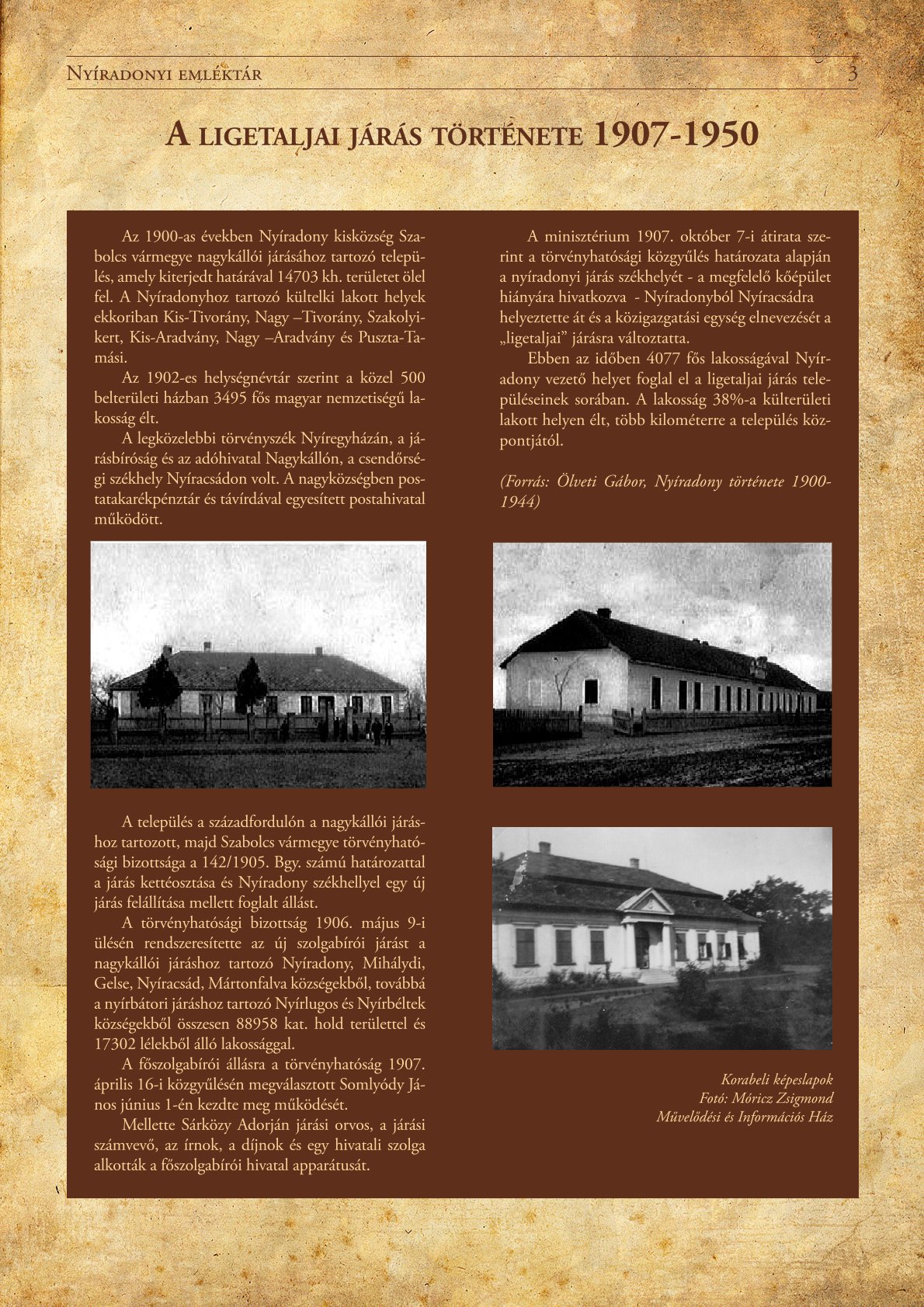 A kiadvány ligetaljai járás történetének állít emléket. Készült a nyíradonyi Móricz Zsigmond Művelődési Házban Kondásné Erdei Mária vezetésével 2013-ban a nyíradonyi járás alapításának évében.